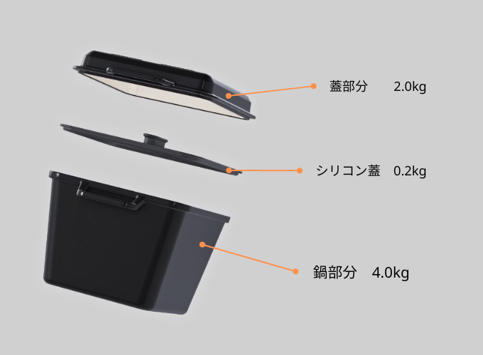 鍋4kg、蓋2kg、シリコン蓋0.2kg